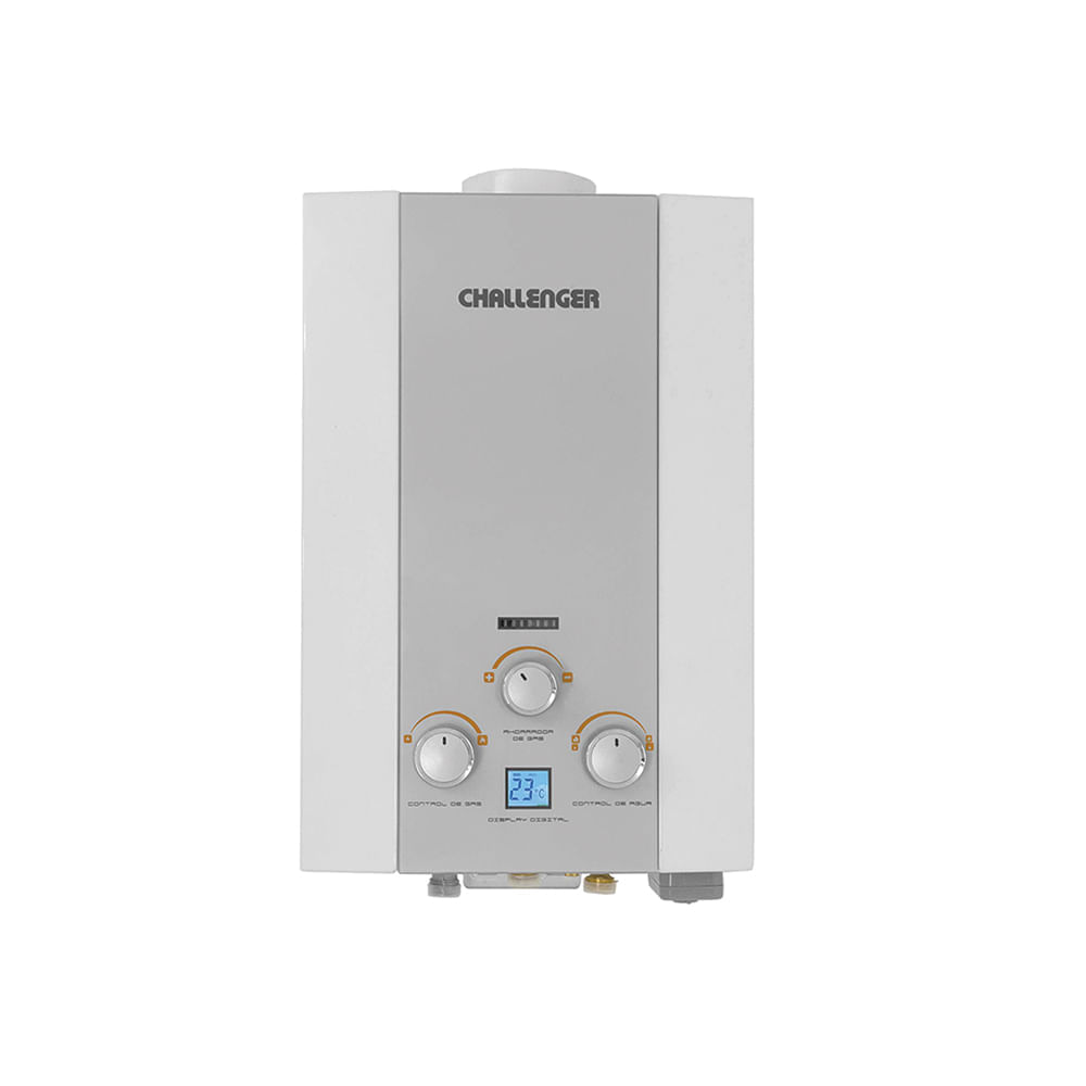| FeaturesHTML | CalentadorPaso a gas naturalTiro natural Máxima eficiencia, confort y seguridad en cada gota de aguaTu calentador CHALLENGER está diseñado para ofrecerte la mejor experiencia en confort y eficiencia energética. Con su elegante frente de cristal templado y display digital, podrás controlar fácilmente la temperatura del agua y monitorear el estado del equipo. Su encendido automático a batería garantiza un funcionamiento sencillo y seguro. Equipado con dispositivos de seguridad avanzada, como el corte de gas en ausencia de llama y la válvula de alivio de sobrepresión, este calentador asegura un hogar seguro y libre de riesgos. Además, su evacuación de humos por tiro natural y su diseño compacto lo hacen perfecto para cualquier hogar con buena ventilación. ¿Cual es el calentador ideal para tu hogar?Tiro naturalFunciona con baterias