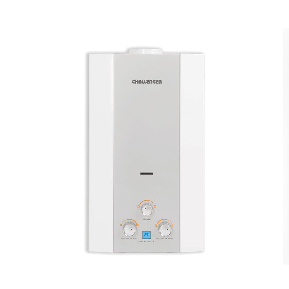 | FeaturesHTML | CalentadorPaso a gas naturalTiro natural Máxima eficiencia, confort y seguridad en cada gota de aguaTu calentador CHALLENGER está diseñado para ofrecerte la mejor experiencia en confort y eficiencia energética. Con su elegante frente de cristal templado y display digital, podrás controlar fácilmente la temperatura del agua y monitorear el estado del equipo. Su encendido automático a batería garantiza un funcionamiento sencillo y seguro. Equipado con dispositivos de seguridad avanzada, como el corte de gas en ausencia de llama y la válvula de alivio de sobrepresión, este calentador asegura un hogar seguro y libre de riesgos. Además, su evacuación de humos por tiro natural y su diseño compacto lo hacen perfecto para cualquier hogar con buena ventilación. ¿Cual es el calentador ideal para tu hogar?Tiro naturalFunciona con baterias